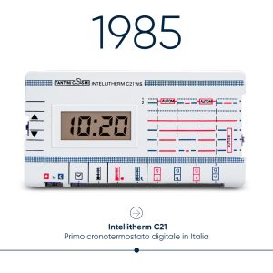 Programmare accensione e spegnimento del riscaldamento in base alle nostre abitudini è oggi un gesto quotidiano, ma dietro questa semplicità si nasconde una lunga storia di innovazione. Una storia che comincia esattamente 40 anni fa, nel 1985, quando Fantini Cosmi presentò al mercato il primo cronotermostato digitale, l’Intellitherm® C21, rivoluzionando per sempre il modo di gestire il comfort domestico.