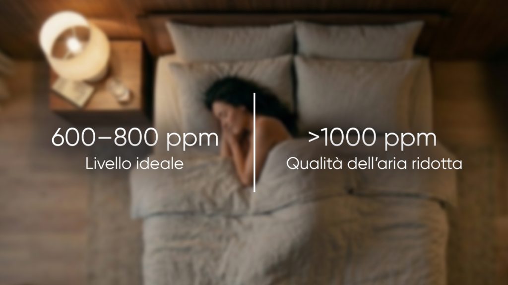 Durante la notte, respirando, consumiamo ossigeno e produciamo CO₂. In una stanza chiusa o poco ventilata, i livelli possono facilmente superare i 1000 ppm, soglia oltre la quale la qualità dell’aria inizia a peggiorare.