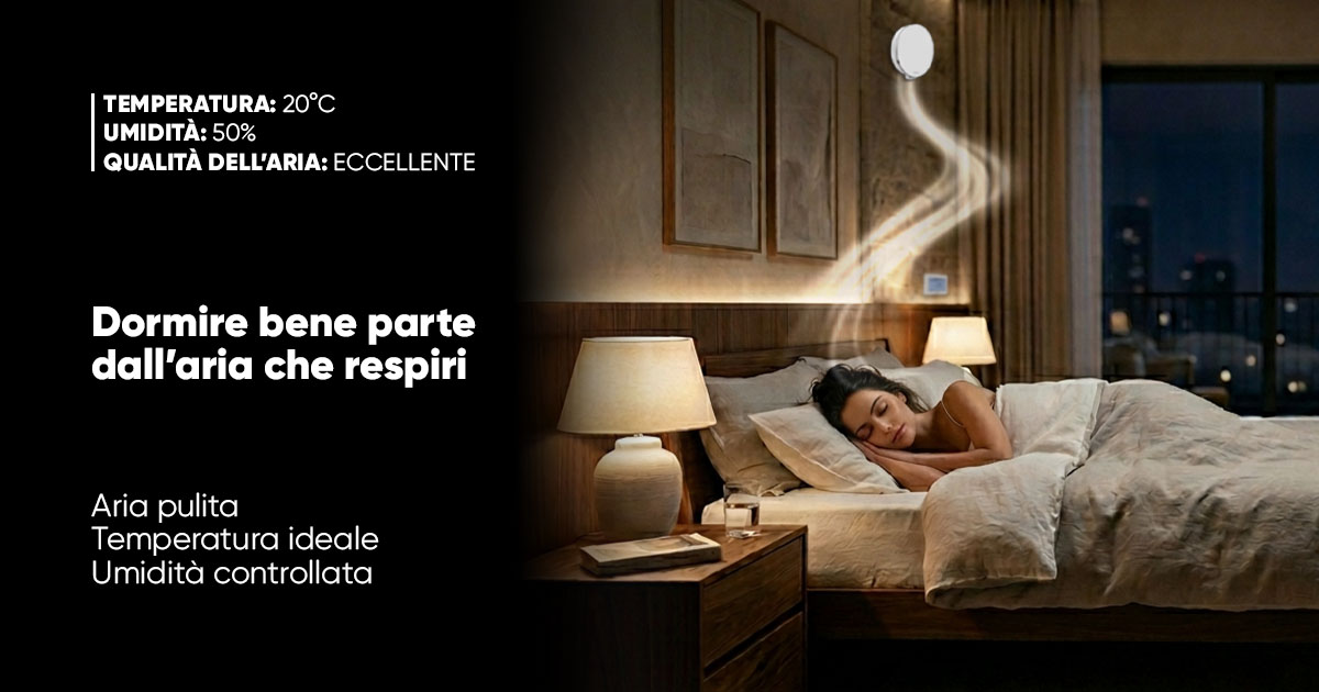 Garantire condizioni ottimali durante tutta la notte non è semplice se ci si affida solo a soluzioni manuali come aprire le finestre. Serve un approccio più evoluto, capace di gestire automaticamente il comfort indoor e in grado anche di contrastare livelli elevati di CO2 e la presenza di polvere, muffe, pollini, allergeni e VOC prodotti da sostanze chimiche presenti negli arredi e in molti prodotti per la casa.