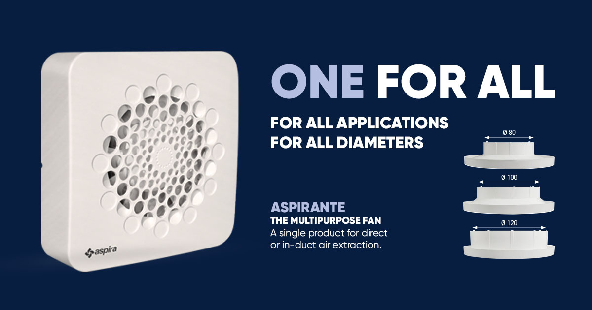 Aspirante is a universal axial fan designed to exhaust air either directly outdoors or through ducting, making it ideal for both new installations and replacement projects. One single model covers the most common diameters – Ø 80, 100 and 120 mm – eliminating the need for installers to select different products depending on the application.