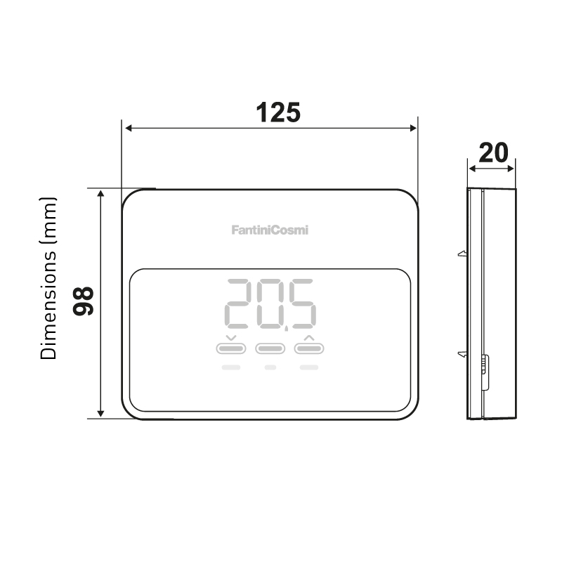 Temperature setting range 2 ÷ 40 °C, increment 0.1 °C Room temperature measurement/display range –50 ÷ +50 °C Control differential STD, 0.3 ÷ 5 K Reference thermal gradient 4 K/h Maximum ambient temperature 45 °C Room relative humidity display range 0 ÷ 99%, increment 1% WiFi connection 2.4 GHz (802.11 b/g/n) Maximum transmitted RF power <10 mW Storage temperature –10 °C ÷ +60 °C Protection rating IP32 Pollution degree 2 Power supply 2 AA 1.5V alkaline batteries or 230 V – 50 Hz (with C800AL power supply) Maximum power consumption +5 W Contact rating 5(3)A 250 VAC Type of action 1 B.U. (Micro-disconnection) Output type 1 relay for heating/cooling (3 screw terminals, normally closed + normally open) Software class A Electrical insulation Double insulation Impulse voltage 4000 V -