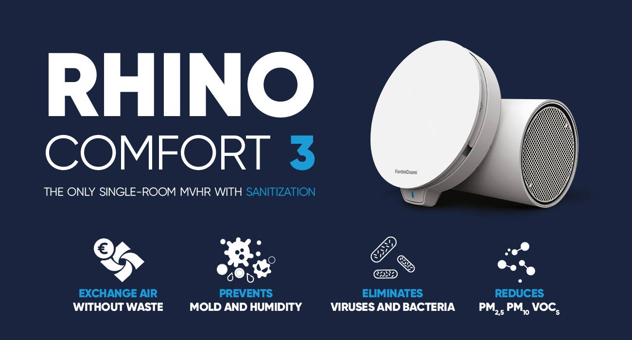 RHINOCOMFORT 3 is the new single room heat recovery unit that marks a turning point in the world of smart ventilation. The result of over two years of research and development, RHINOCOMFORT 3 is the first single-room HRV unit on the market to integrate an air sanitization system, combining high performance, advanced nanotechnologies, and a design tailored for the modern smart home.
