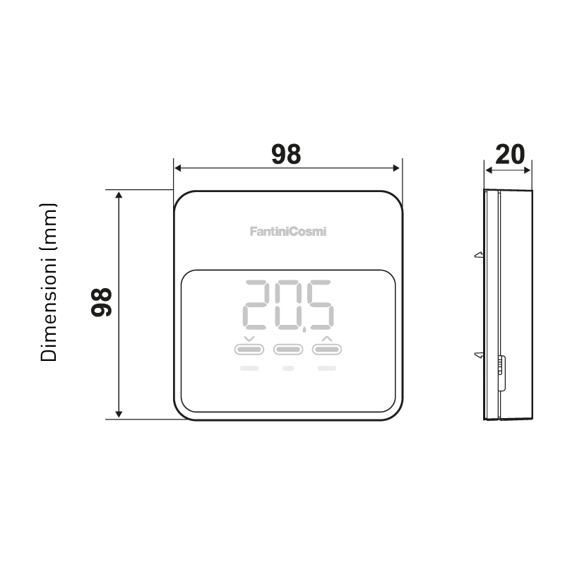 Scala di regolazione temperatura 2 ÷ 40 °C, incremento 0,1°C Scala misurazione/visualizzazione T ambiente –50 ÷ +50 °C Differenziale di regolazione STD, 0,3 ÷ 5 K Gradiente termico di riferimento 4 K/h Temperatura massima ambiente 45 °C Scala di visualizzazione umidità relativa ambiente 0 ÷ 99 %, incremento 1 % Connessione WiFi 2,4 GHz (802.11 b/g/n) Massima potenza a radiofrequenza trasmessa <10 mW Temperatura di stoccaggio –10 °C ÷ +60 °C Grado di protezione IP32 Grado di inquinamento 2 Alimentazione 2 pile stilo alcaline AA 1,5V oppure 230 V – 50 Hz (tramite alimentatore C800AL) Potenza assorbita massima + 5 W Portata contatti 5(3)A 250 Vca Tipo di azione 1 B.U. (Micro disconnessione) Tipo di uscita 1 relè per riscaldamento/raffrescamento (3 morsetti a vite, chiuso + aperto) Software Classe A Isolamento elettrico Doppio isolamento Tensione d’impulso 4000 V -