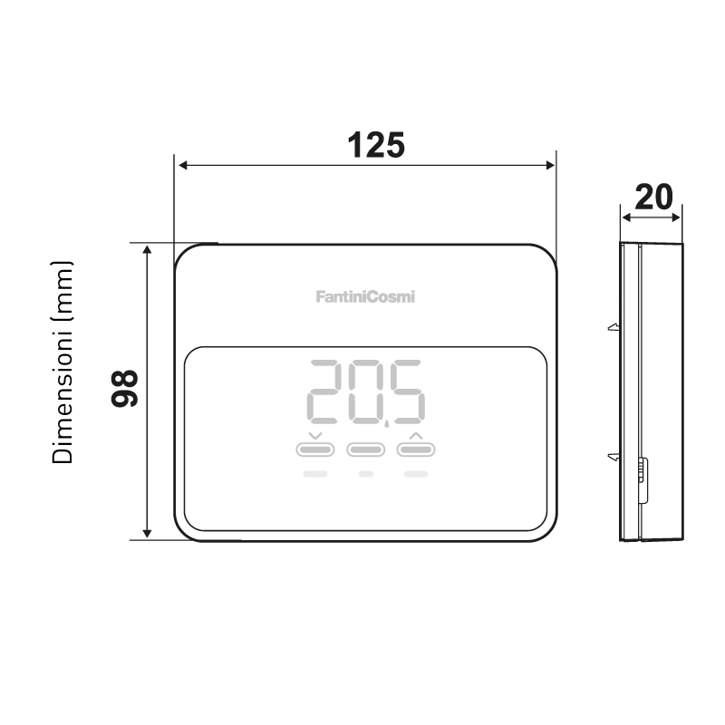Scala di regolazione temperatura 2 ÷ 40 °C, incremento 0,1°C Scala misurazione/visualizzazione T ambiente –50 ÷ +50 °C Differenziale di regolazione STD, 0,3 ÷ 5 K Gradiente termico di riferimento 4 K/h Temperatura massima ambiente 45 °C Scala di visualizzazione umidità relativa ambiente 0 ÷ 99 %, incremento 1 % Connessione WiFi 2,4 GHz (802.11 b/g/n) Massima potenza a radiofrequenza trasmessa <10 mW Temperatura di stoccaggio –10 °C ÷ +60 °C Grado di protezione IP32 Grado di inquinamento 2 Alimentazione 2 pile stilo alcaline AA 1,5V oppure 230 V – 50 Hz (tramite alimentatore C800AL) Potenza assorbita massima + 5 W Portata contatti 5(3)A 250 Vca Tipo di azione 1 B.U. (Micro disconnessione) Tipo di uscita 1 relè per riscaldamento/raffrescamento (3 morsetti a vite, chiuso + aperto) Software Classe A Isolamento elettrico Doppio isolamento Tensione d’impulso 4000 V -
